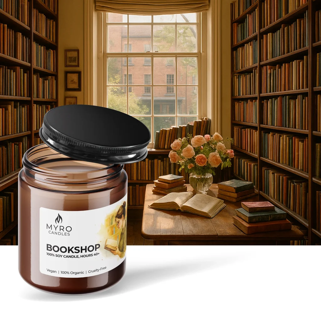 Η μαγεία ενός παλιού βιβλιοπωλείου σε ένα κερί. Παλαιωμένο δέρμα, δαμάσκηνο, βανίλια Μαδαγασκάρης, παιώνια και ροδάκινο συνθέτουν ένα αρωματικό ταξίδι στη νοσταλγία.